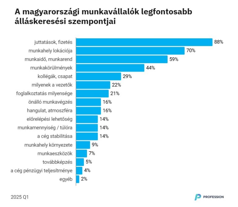 A felmérésről: Az álláskeresési attitűdöket vizsgáló, 18-65 év közötti magyar lakosság körében országosan reprezentatív, rendszeres, online felmérést 1000 fős mintavétellel készítette a Profession.hu 2025 első negyedévében.